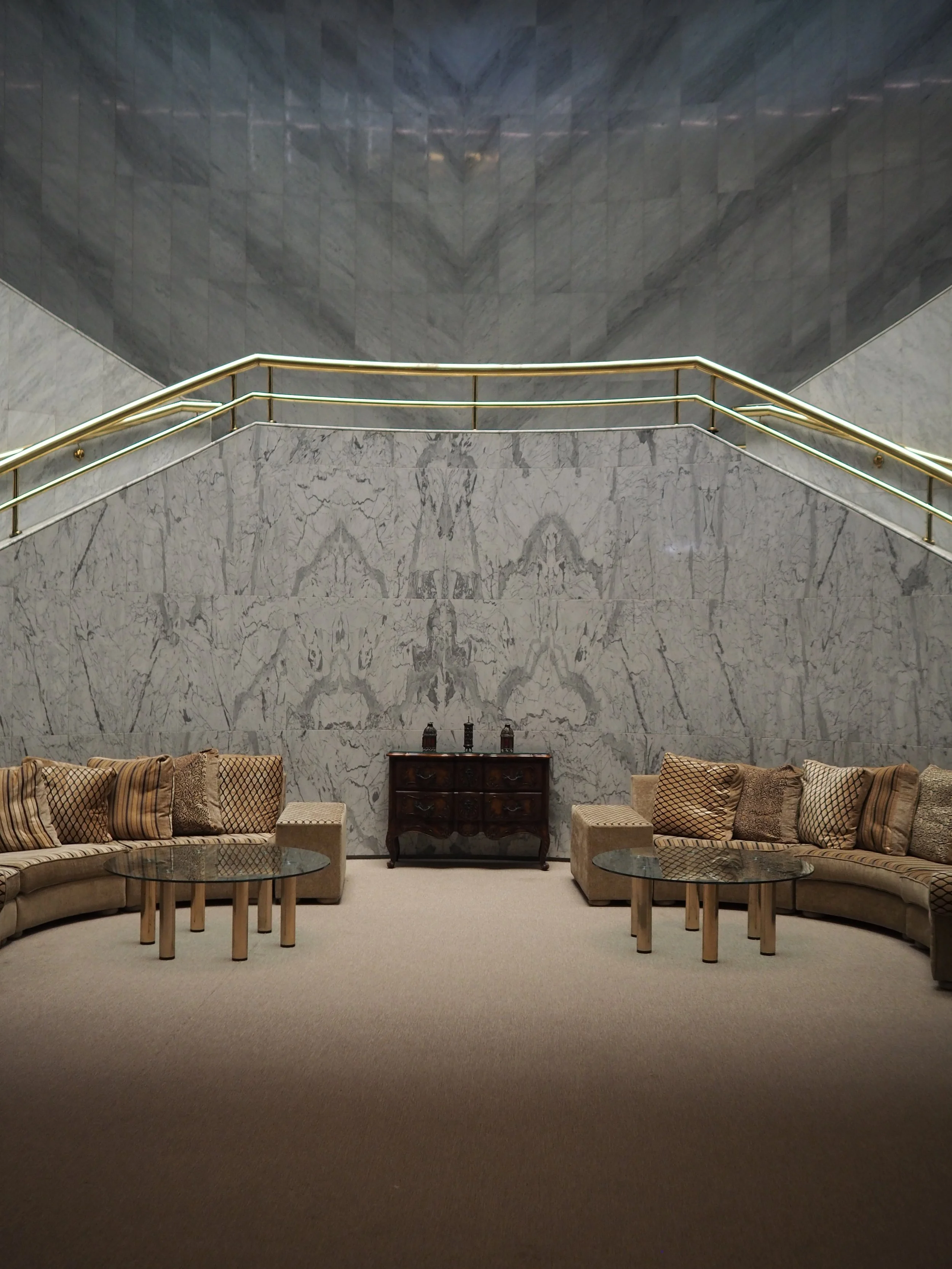 Idę dalej, w mocno geometrycznych przestrzeniach zaczynają pojawiać się złote elementy, tapicerowane meble rodem z królewskiego majelisu, mocne granatowe akcenty, gdzieniegdzie zamiast marmuru - granit. Jest pusto, a mocne formy przestrzeni są zaaranżowane symetrycznie niemal na granicy obsesji. Po raz pierwszy w życiu doświadczam tzw. “liminal space” - te opuszczone, surrealistyczne, nieco przerażające przestrzenie, są jednocześnie niesamowicie fascynujące. Słyszę miarowe uderzenia, i w poczuciu odrealnienia wyobrażam sobie, że to na pewno ktoś gra tu w tenisa. Okazuje się jednak, że są to dźwięki budowy, dochodzące zza białej plandeki. Czyżby to oznaczało zatem, że to wspaniałe marmurowe uniwersum, pamiętające wizyty Jacquesa Chiraca i Gerharda Schroedera we wczesnych latach 2000, miało przestać niedługo istnieć?
