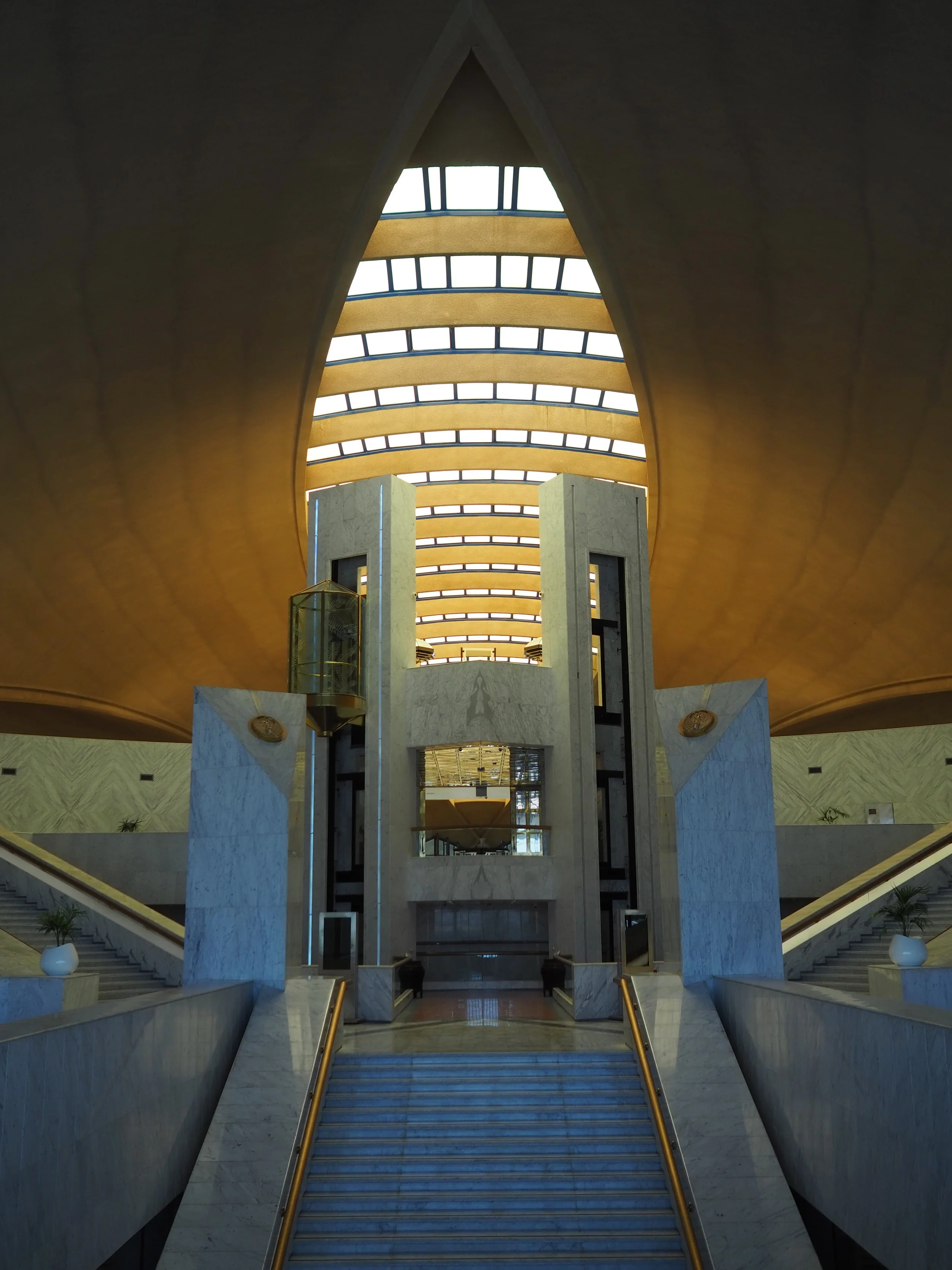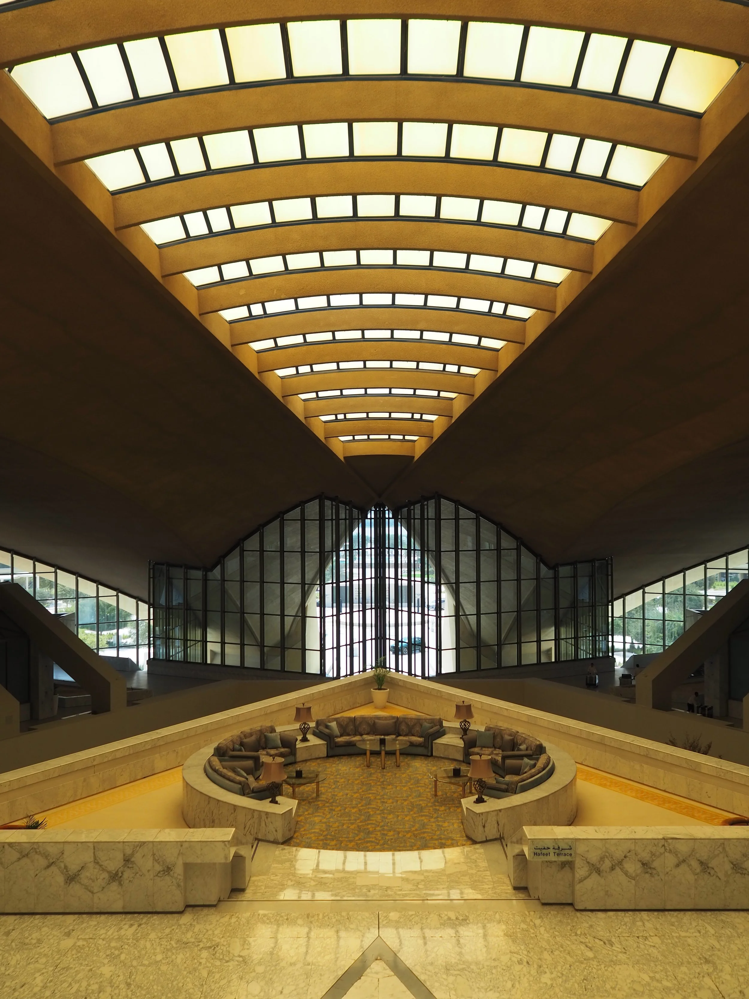 Już z zewnątrz budynek robi niesamowite wrażenie. Ma w sobie coś futurystycznego, wygląda jak zrywający się do lotu statek kosmiczny, choć oficjalnie został zaprojektowany - a jakże - w formie sokoła. Jego idealna symetria budzi respekt i lekki niepokój. Wchodzę do odnowionej części hotelowej. Otworzone dla gości w 2023 roku wschodnie skrzydło przeszło porządny lifting, jego wnętrza są eleganckie, minimalistyczne i ciepłe; nowoczesne w palecie materiałów i formach, a jednocześnie nawiązujące do tradycji za pomocą dzieł lokalnego rzemiosła z Zatoki oraz elementów plecionych z liści palmy.